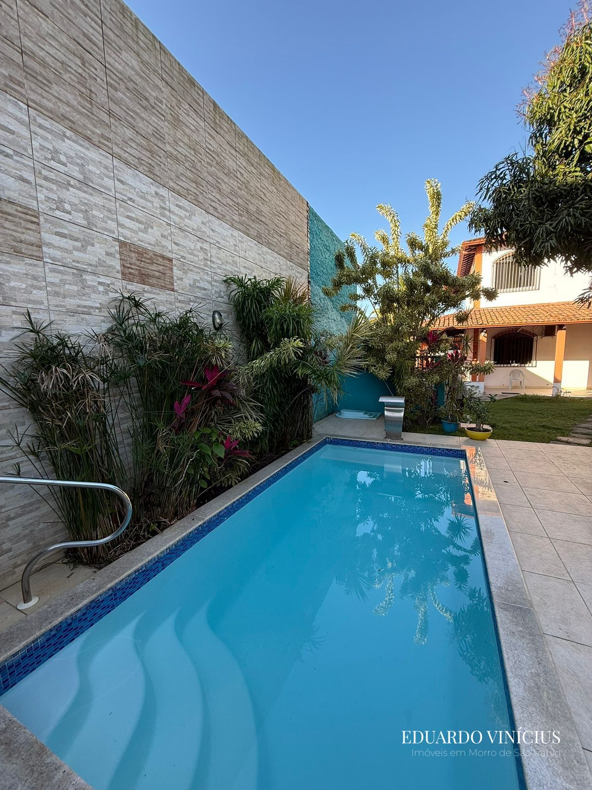 Piscina com cascata, corrimão de segurança e jardim ao redor, incluindo a casinha para os cachorros.